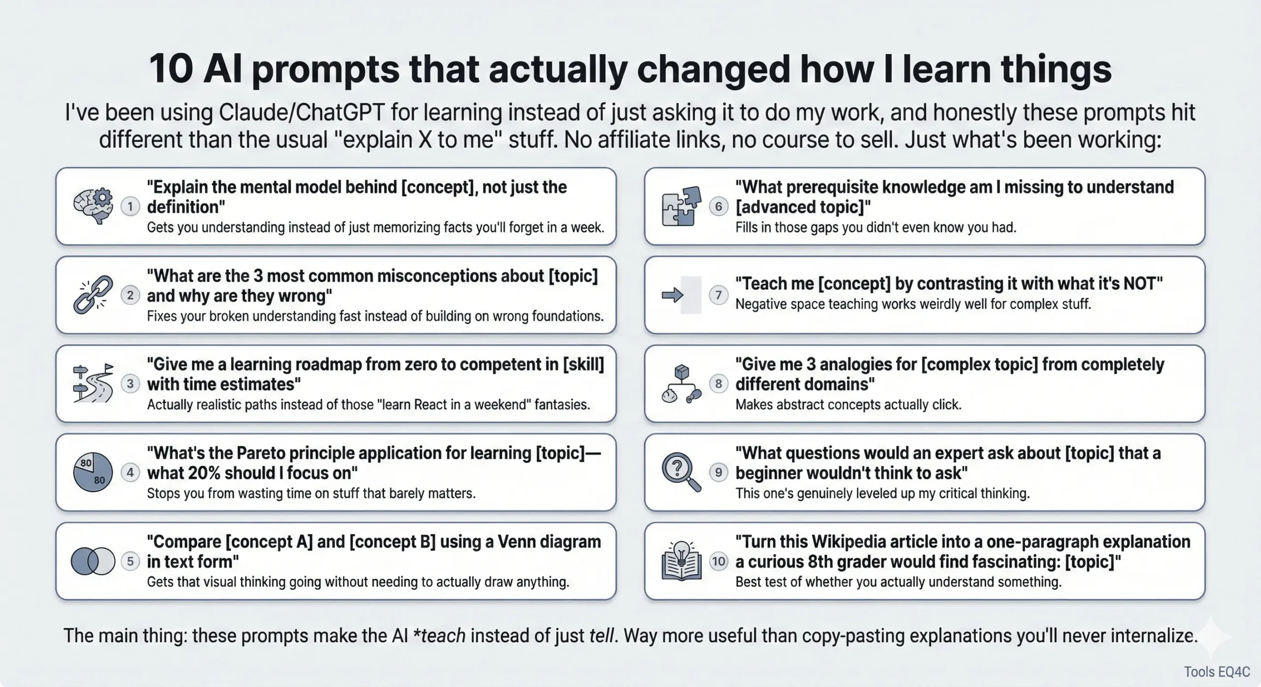 The main thing: these prompts make the AI teach instead of just tell. Way more useful than copy-pasting explanations you’ll never internalize.