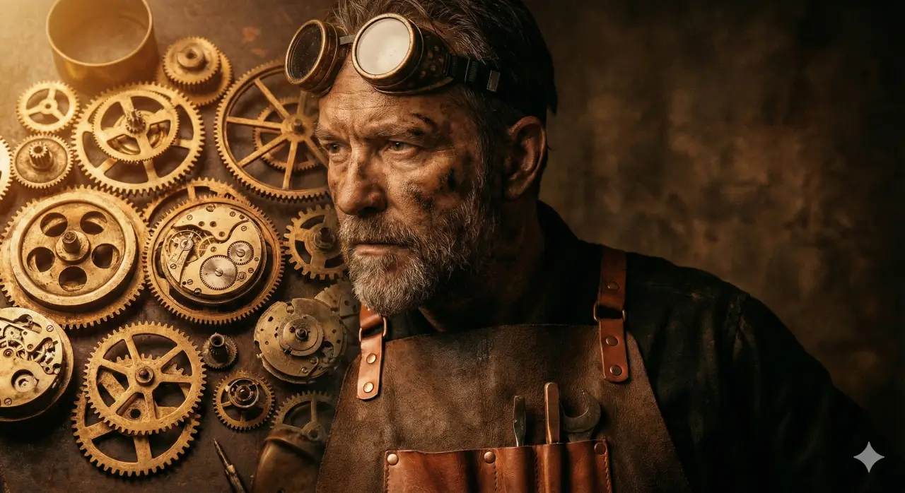 A weathered steampunk mechanic photographed in close-up portrait, 3/4 angle from the left. Subject wears brass-rimmed goggles pushed up on forehead, leather apron with copper tool straps. Intricate brass gears visible on work surface surrounding face. Warm golden hour side lighting casting defined shadows. Rich sepia and burnt orange color grading. Studio photography style with dark vintage background.
