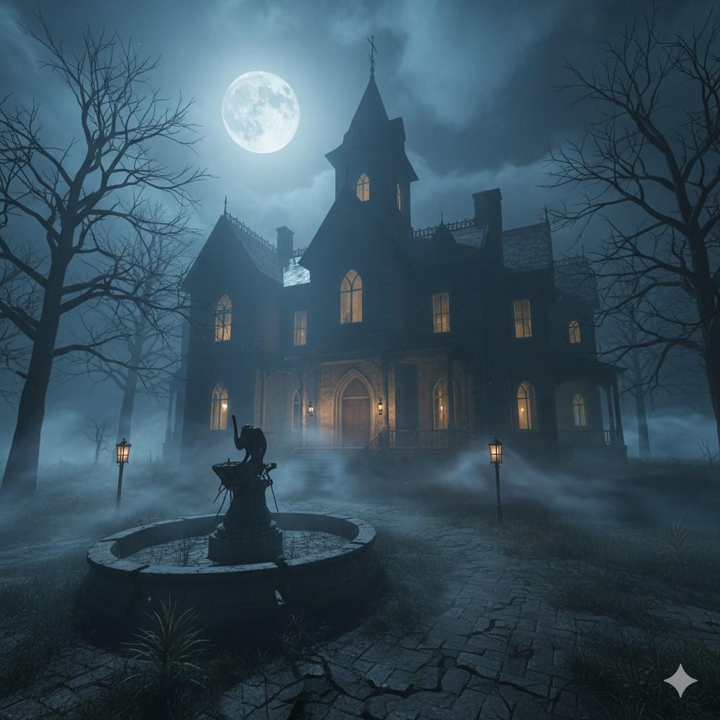 Use case: Create a moody, cinematic Halloween mansion scene for invites or social media.